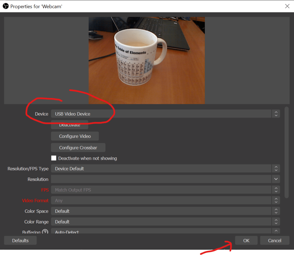 4. Select the Webcam or capture device you want to use and press the “OK” button. In my case my webcam showed up as “USB Video Device”