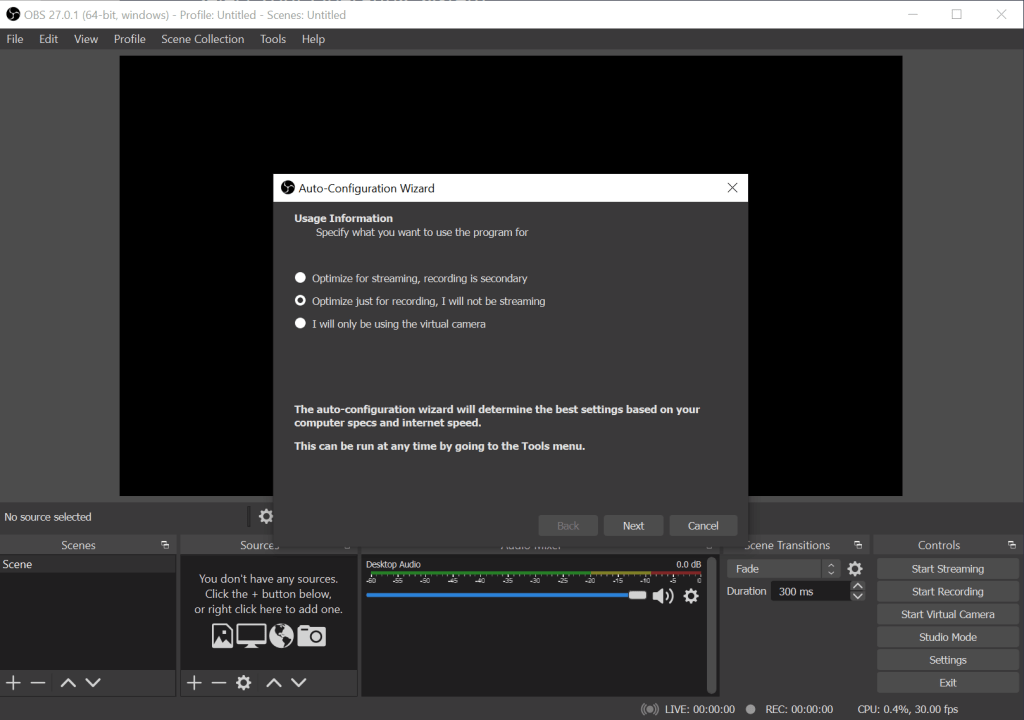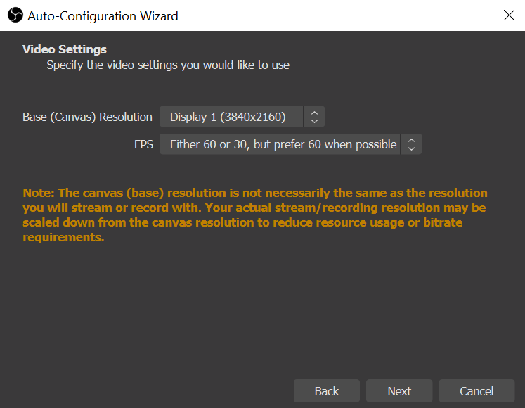 8. OBS will figure out the best set-up for you and then show you the settings. In my case the monitor I’m recoding from the UHD so it’ll auto-scale down to 1920×1080 to avoid too much bandwidth use.