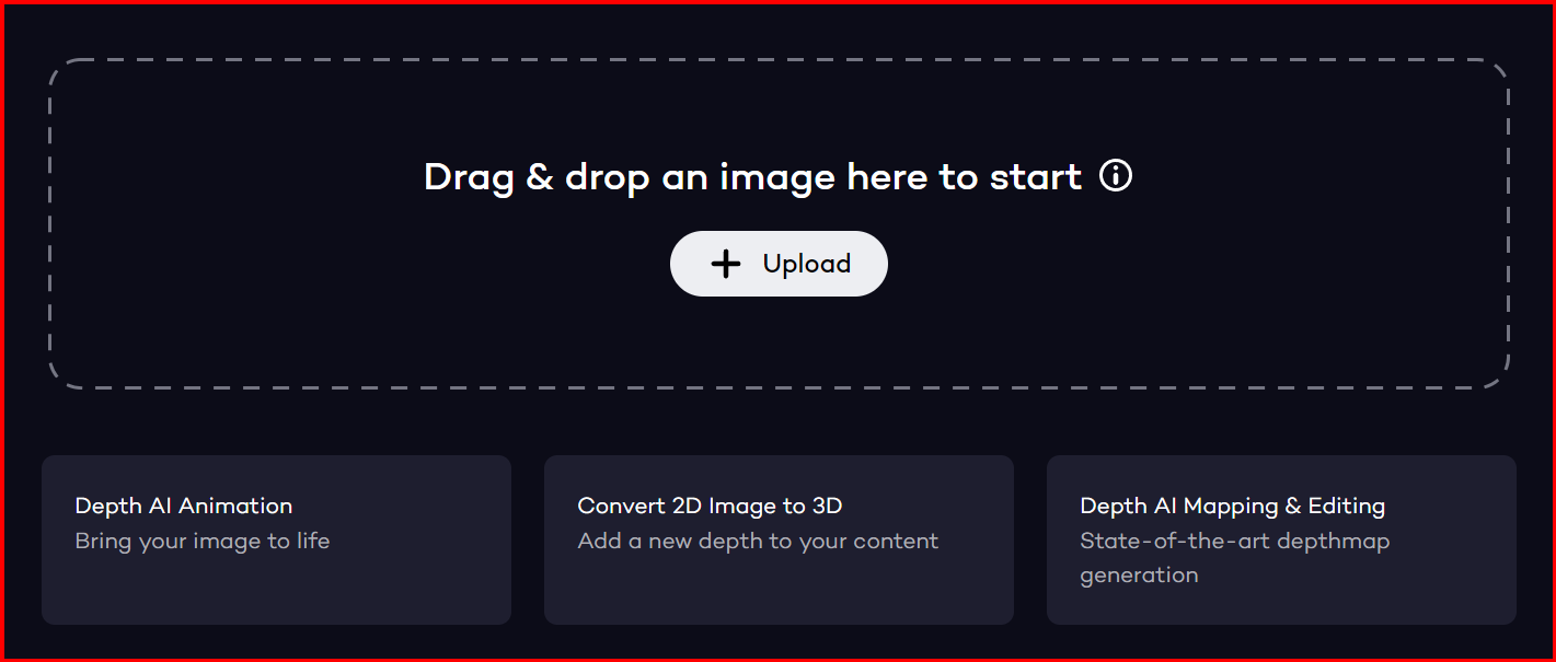 Very simple to use; just drag’n’drop an image (or photo) into the Upload area and use “Convert 2D Image to 3D”. This extracts depth information from the image and gives you a 3D animation.