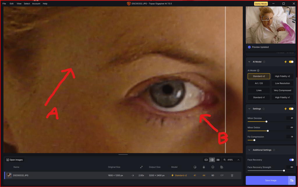 In the ‘Before’, you can easily see the artefacts caused by the compression (A) and the pixilation caused by the low resolution of the image (B)…