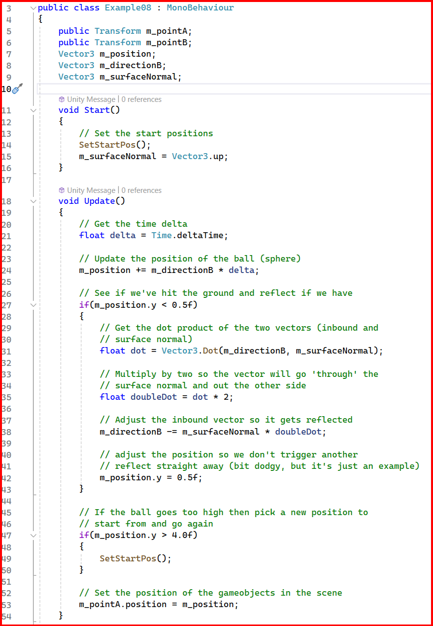 The code has been set up to make the ball bounce when it gets below 0.5f in the Y. This way, it makes it look like the ball has hit the surface although it’s actually just hitting a specific height before getting reflected.