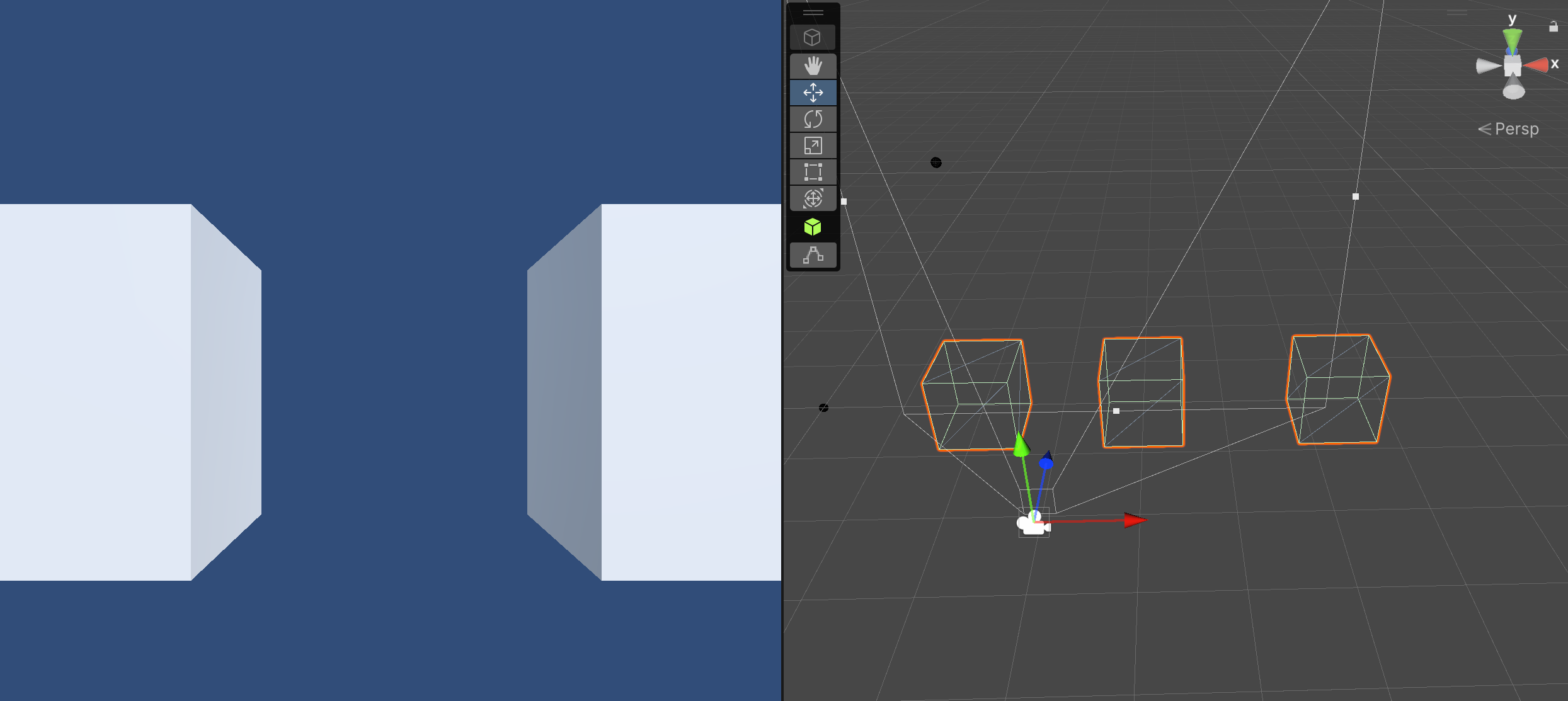 The view on the left shows what the camera actually sees (the area inside the frustum)